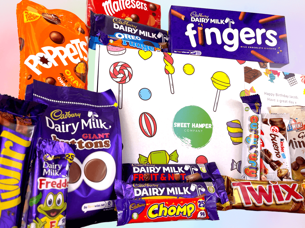 The Sweet Hamper Company presents our huge chocolate box! It's one set up from our large chocolate box and contains 17 classic chocolate bars and delectable chocolate treats. From a Large Dairy Milk Oreo Bar, Poppets and large bag of Galaxy Minstrels.